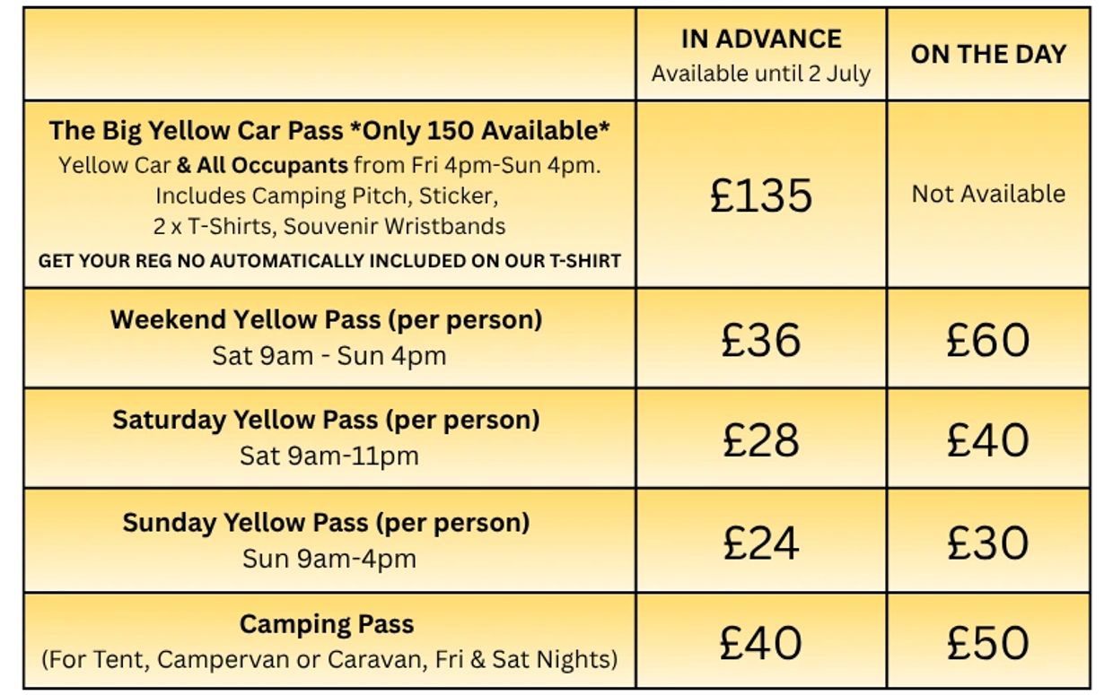 If you're coming to the show in a yellow car, you can book your place at the show now! The best value option is our Big Yellow Car Pass which admits everyone in the car and includes camping, car sticker, t-shirts and souvenir fabric wristbands for all members of your party. Your reg will also be included on the back of our 2026 t-shirt.